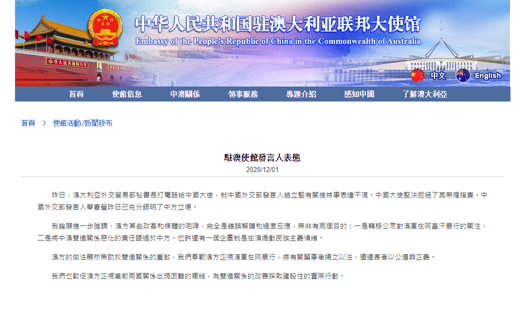而中國駐澳洲大使館對該事件則僅在官網發出聲明,透露澳洲外交貿易部秘書長已經去電中國大使,就中國外交部發言人趙立堅有關推特貼文表達不滿。但大使館強調,「中國大使堅決拒絕了其無理的指責,並指這件事是某些政客和媒體的咆嘯,完全是錯誤解讀和過度反應,目的在轉移公眾對澳軍在阿富汗暴行的關注以及將中澳雙邊關係惡化的責任諉過給中方,並指這是在煽動民族主義情緒。」