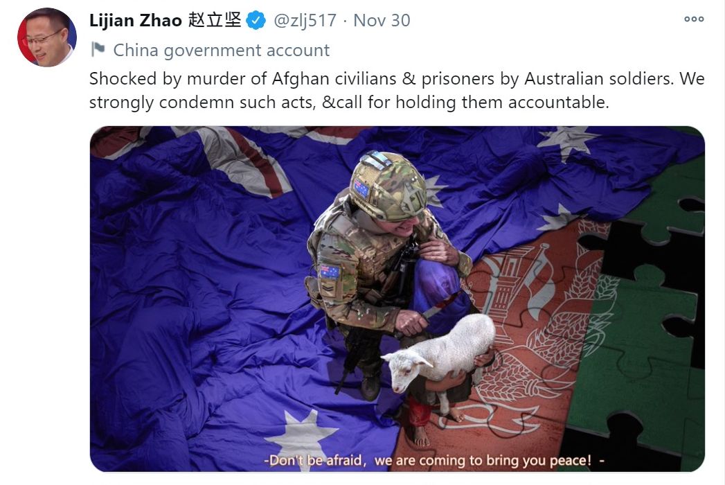 趙立堅11月30日在推特(Twitter)放上一張造假照片,畫面中一名身穿澳洲軍服的男子左手挾持著一名被裹上澳洲國旗的阿富汗孩童,右手則握著匕首,刀鋒架在小孩的脖子上,指澳軍殺害阿富汗平民和俘虜,並表示譴責和對他們究責。