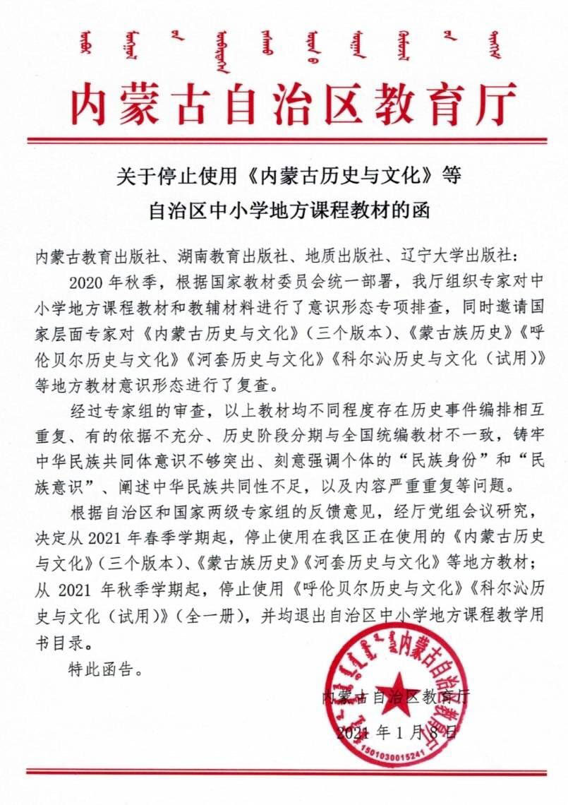《自由亞洲電台》、《大紀元》報導,內蒙古自治區教育廳近日向多家出版社發出文件,表示按國家教材委員會指示,對全區中小學地方教材和輔助教材進行「意識形態專項排查」,文件中指出,經過複查後,認為有五套教材「共同意識不夠突出」、刻意強調個體「民族身分」和「民族意識」等問題。內蒙古教育廳決定,從今年春季學期起會分階段停用這些教材。