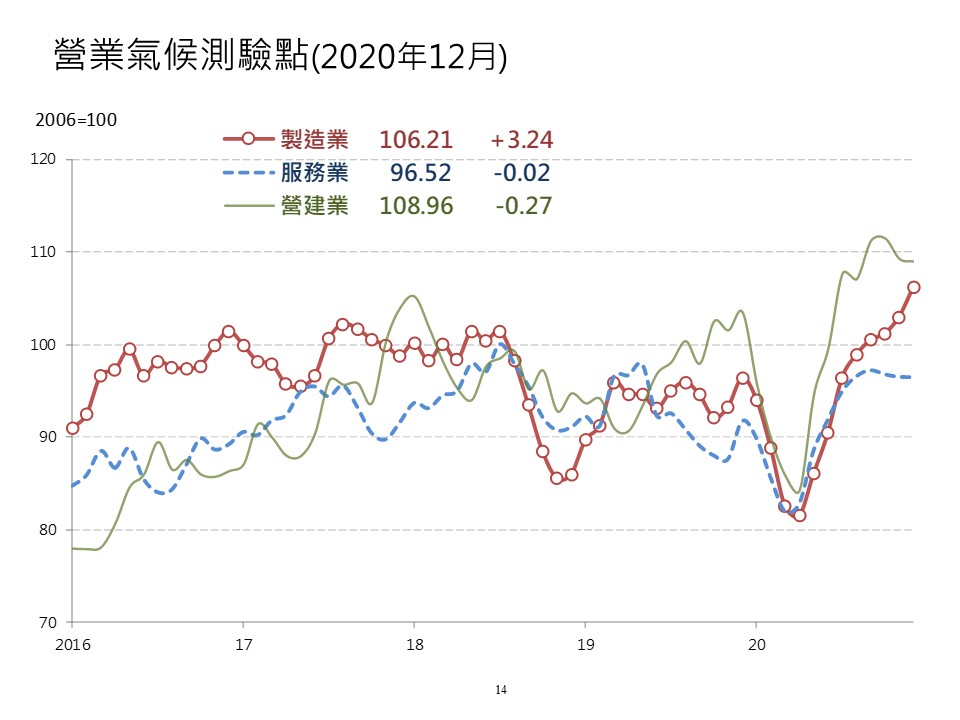 台經院指出,去年12月製造業營業氣候測驗點為106.21點,較上月增加3.24點,連續第八個月上揚,創2007年10月以來新高;服務業為96.52點,較上月微幅下滑0.02點;營建業為108.96點,較上月下滑0.27點,連續第二個月下滑。