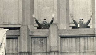 1970年11月25日 三島、森田在總監部陽台三呼「天皇陛下萬歲」後退入室內,切腹自決。(寫真出自網路)
