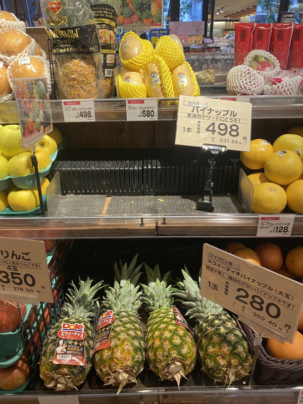 日本民眾得知台灣鳳梨受到中國打壓突然無法出口到中國後,表示要買台灣鳳梨為台灣加油。圖為東京都目黑區的超市Life,7日傍晚台灣鳳梨賣光,菲律賓鳳梨還剩很多。 (圖:中央社)