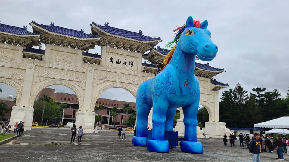 這幾天經過中正紀念堂的民眾,都會看到一隻身高10公尺、身長13公尺、肩寬4.5公尺的巨型馬藝術裝置矗立在廣場上,這是紙風車劇團全新製作新戲「雨馬」中的主角,由400公尺、3公噸鋼管組成骨架,150加侖的纖維彈性水泥塑成肌肉,藍色馬身,為客家藍染延伸發想,馬身上彩繪象徵客家文化的花紋與紋飾,馬鬃與馬尾漆上七彩顏色,意喻雨後幸福的約定,整匹馬神情姿態看上去顯得朝氣昂揚。