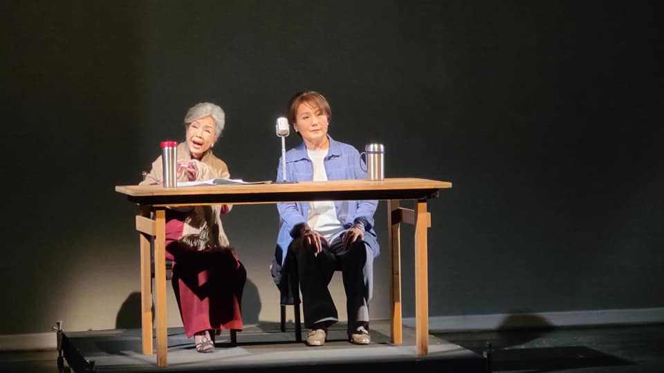 國寶藝師廖瓊枝(左)與資深歌仔戲藝人趙美齡(右)客串演出廣播員,重現廖瓊枝當年經典之作「望鄉之夜」。(江昭倫 攝)