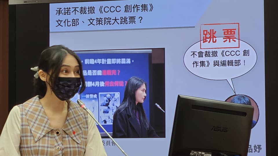 對於《CCC創作集》事件爭議不休,立委們要求文策院務必做好溝通,不過從三月份就開始關注此事並提出質詢的民進黨立委賴品妤卻對文策院的態度表達高度不滿,認為文策院從三月到現在,許多說法前後不一,也沒有積極作為,承諾跳票,才會導致《CCC創作集》持續空轉三個月。賴品妤:『(原音)我在這裡必須要很嚴厲指出,《CCC創作集》這個事件會弄到各界天怒人怨,一切都是文策院自己的傲慢跟誤判,首先第一個是說,文策院不段說行政疏失導致經費不足,這種話你敢説喔,你在今天報告還這樣寫,才會導致說現在出現空轉的狀況,但是事實上文策院自已早就知道這個前瞻預算會今年三月截止, 卻沒有做出任何因應方案,這怎麼是行政疏失,這不是疏失,這是行政的怠惰跟行政的失職。』