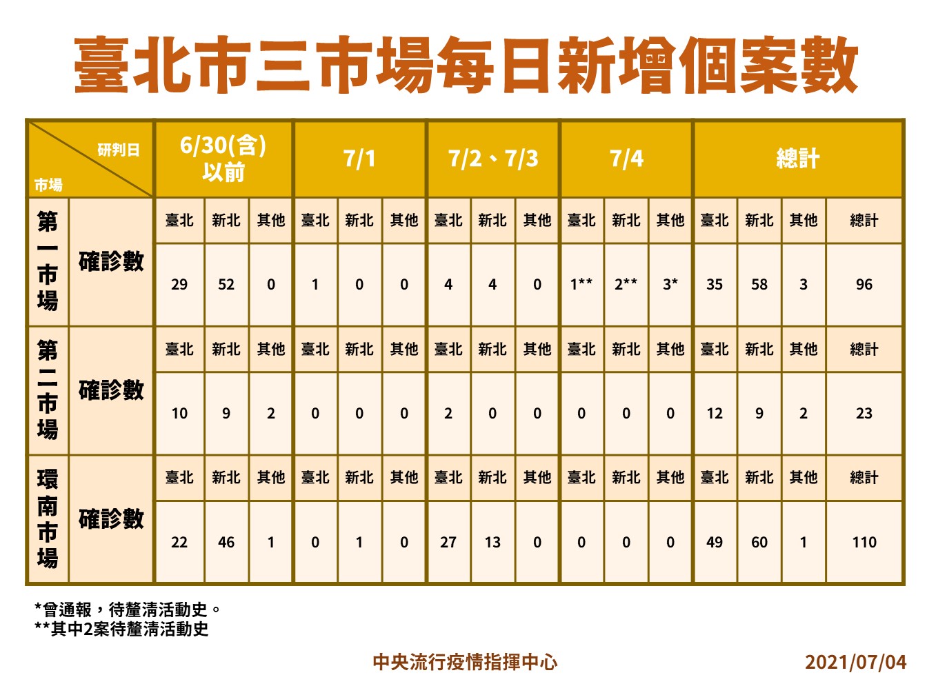 中央流行疫情指揮中心指揮官陳時中表示,這幾天在北農第一市場總計篩檢了5,109人、第二市場2,658人、環南市場也採驗了3,572人,實際新增確診個案,第一市場總計96案、第二市場23案、環南市場則是110案。
