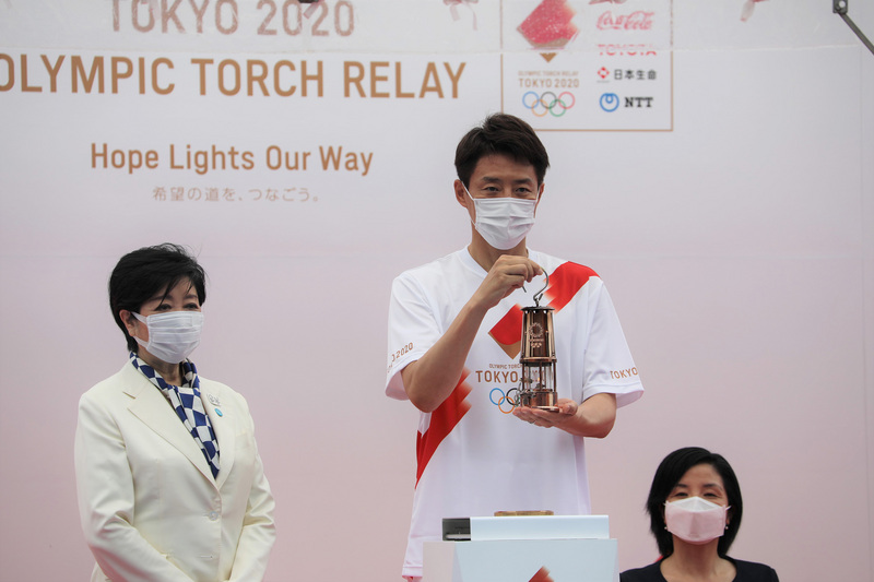 聖火裝在透明小燈籠裡,由聖火傳遞大使、曾3度參加帕運的日本射擊女將田口亞希遞給小池。田口表示,很期待看到匯集大家心意的聖火在東奧主場館聖火台被點燃。她之後將聖火小燈籠交給東京聖火傳遞第一棒、前網球選手松岡修造。