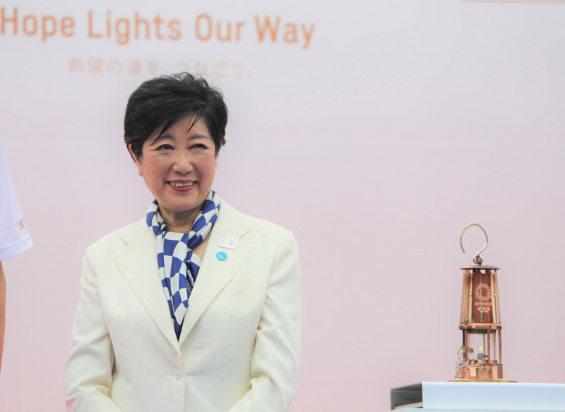 在東京的聖火公開儀式上,身穿乳白色套裝、圍著東奧圖案圍巾的小池百合子致詞說:「全國人民以強烈的意念和努力克服嚴峻的狀況,聖火代表著『希望之路』延續傳遞至此,跑者不論年齡、性別、職業、身障及國籍等,各將自己的意念融入聖火,延續到奧運場館,盼大家一起加油。」
