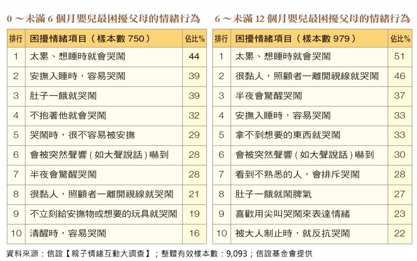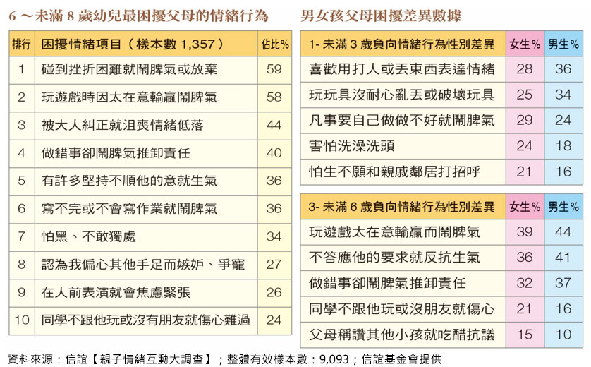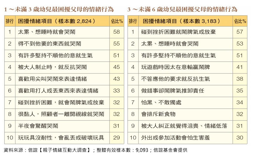 信誼基金會調查台灣親子情緒互動情形,透過網路問卷共收到9,093名0到8歲嬰幼兒家長的回覆。分析顯示,父母對未滿1歲的嬰兒,最感到困擾的是「太累、想睡時就會哭鬧」;1到3歲時,則發現孩子常因「得不到想要的東西就哭鬧」;來到3至6歲,開始困擾孩子「碰到挫折困難就會鬧脾氣或放棄」,及「玩遊戲太在意輸贏」;到了6至8歲,則容易出現「被大人糾正,就覺得沮喪、情緒低落」或「做錯事卻鬧脾氣推卸責任」的情況。