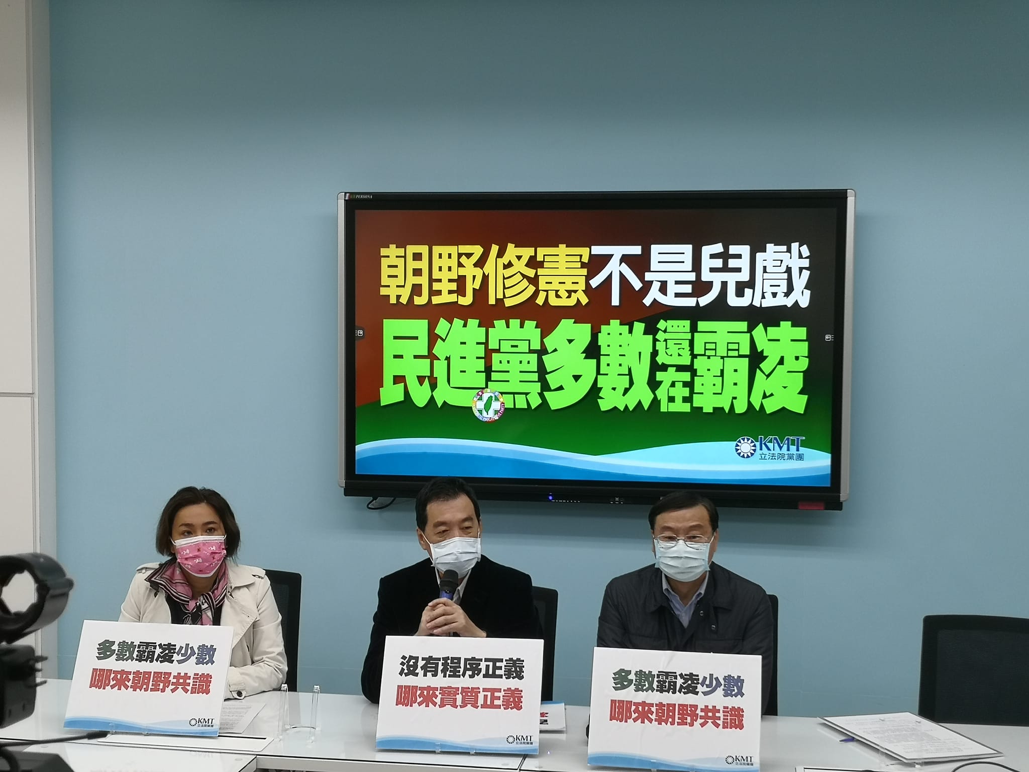立法院修憲委員會7日則召開第三次全體會議,並進行75項修憲案的提案說明,但國民黨立委再度全體缺席會議。國民黨團總召費鴻泰舉行記者會表示,民進黨對於修憲其實只要一條,就是修憲門檻降低,一旦在2022公投綁大選通過,民進黨就會在2024大選時製造出紛爭,提出重新定義國土、修改國歌國旗國號等修憲提案,造成世界兩岸緊張,屆時再用反中保台,繼續贏得政權。費鴻泰說,修憲是何等大事,至少要召開國是會議凝聚社會共識。費鴻泰說:『(原音)不要玩破壞國家體制的修憲會議,奉勸民進黨回頭是岸,不要假借下修投票到18歲這麼簡單的事情,來包裝降低修憲門檻。』