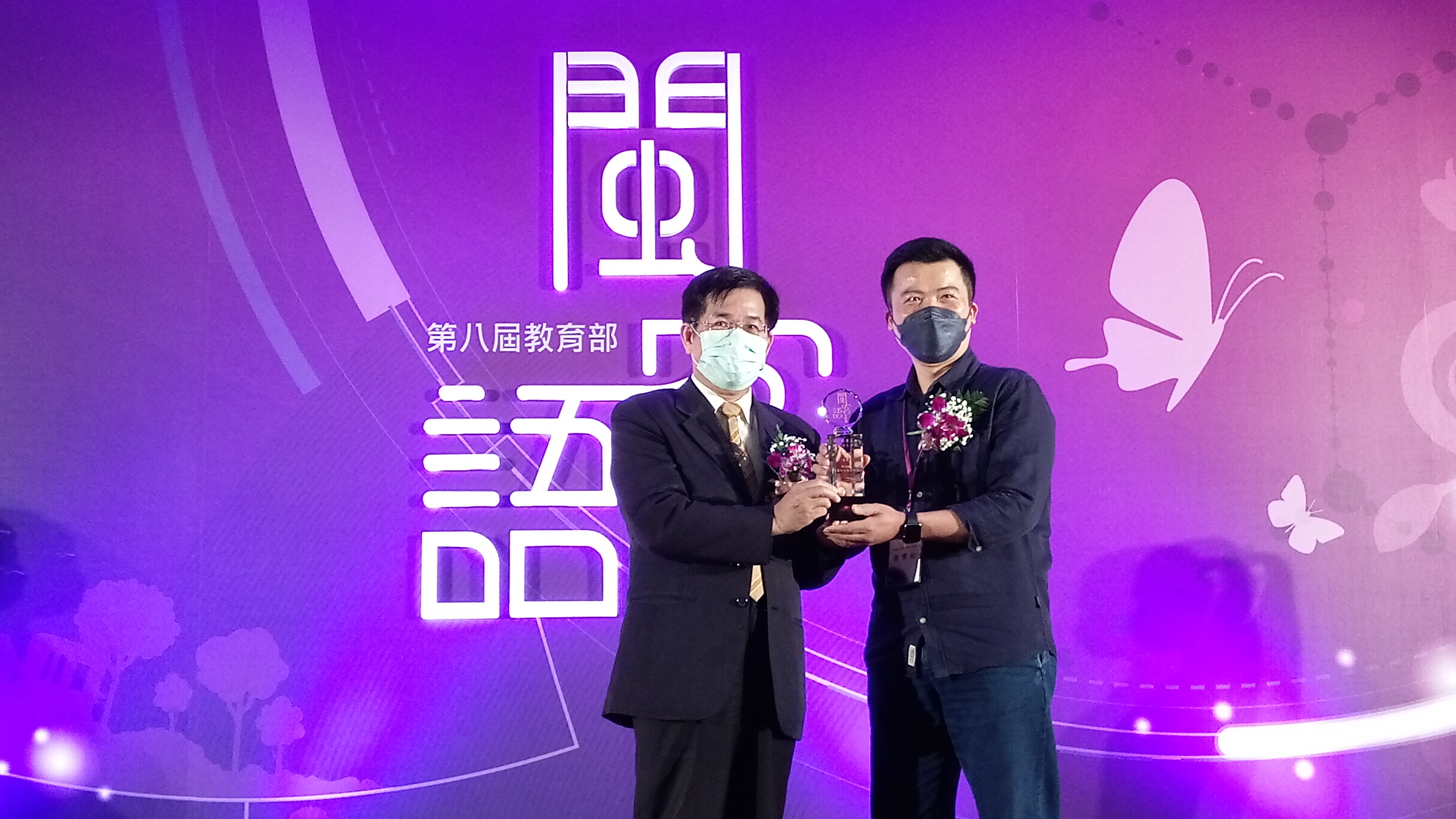 台北市中正高中國文老師張青松(右)獲得閩南語短篇小說類教師組第一名。(陳國維 攝)