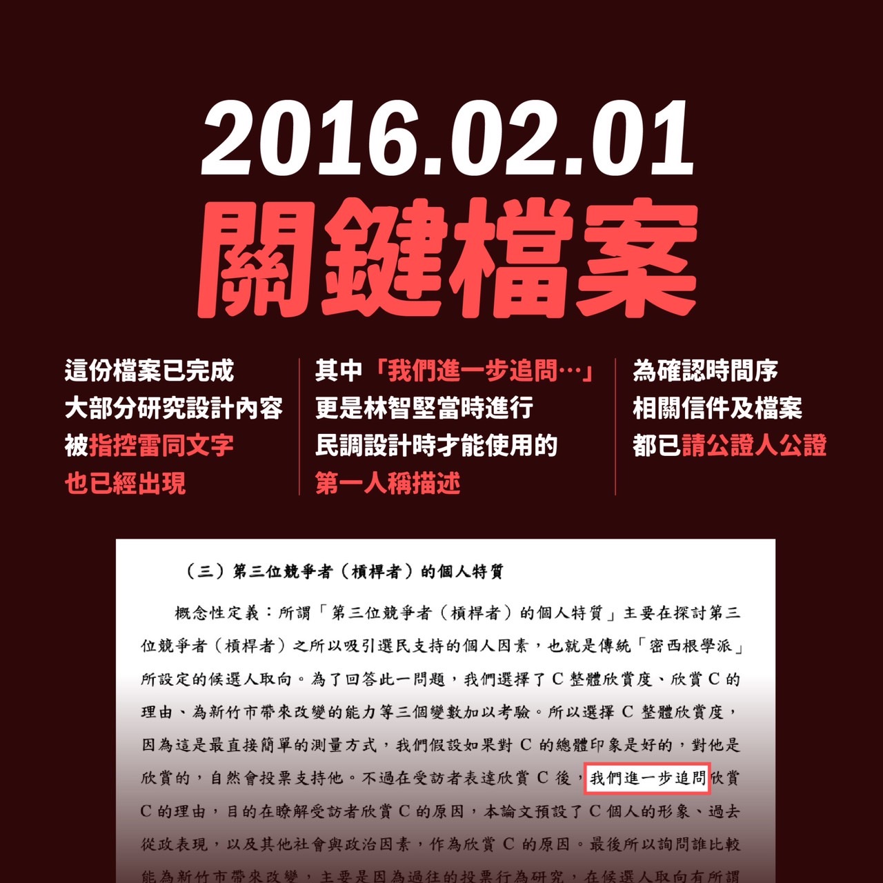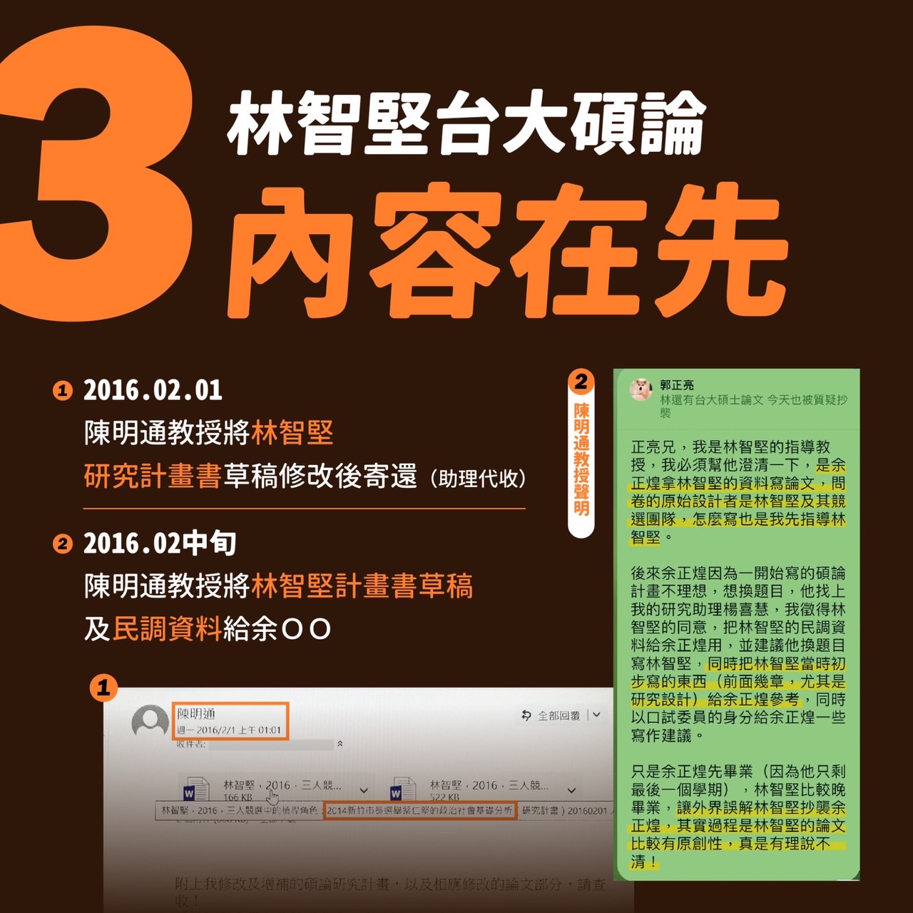 林智堅在會中公布與指導教授陳明通的電子郵件通信證據,強調台大國發所論文部分,他的「發想在先、研究大綱在先、研究設計寫作也在先」,他和另一名研究生余正煌的論文,有很多雷同處是在「研究設計」的部分,但他於2015年12月左右完成第一版研究大綱,2016年1月30日與陳明通討論研究計畫草稿後,陳明通於同年2月1日將研究計畫草稿修改後寄還給林智堅,由助理代收;但此時另一名研究生余正煌因口試委員要求無法達成而求助陳明通,陳明通建議余正煌更換論文題目,並把林智堅的民調資料給余正煌參考。林智堅說,他是善意資料提供者,陳明通是盡責的指導老師,余正煌是積極想要完成學業的學生,他是論文的原創、絕無抄襲。林智堅說:『(原音)1月30日和老師討論修正後給我的版本,而這個研究設計的版本就是大家在台大論文中看到有雷同的地方。而3月8日就是老師寄給余先生的資料。這兩本就是我們公證要告訴大家的,台大的論文我沒有抄襲、我才是原作者。』