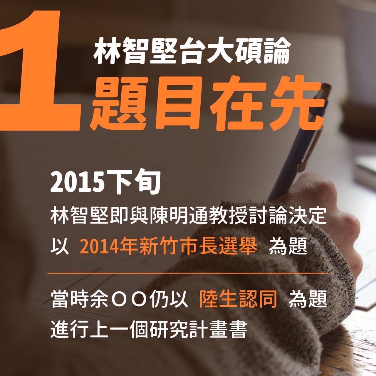 民進黨桃園市長參選人林智堅爆論文爭議,他當年的台大國發所指導教授、現任國安局長陳明通發出4000多字聲明強調林智堅是論文的原創者後,林智堅24日在立委鄭運鵬、律師黃帝穎的陪同下,於民進黨中央黨部召開碩士論文記者會,並出示台大國發所及中華大學科管所兩份論文的時間順序與寫作過程,證明台大國發所的碩論他是原創,中華大學科管所的碩論著作權歸屬也是他的研究歷程。