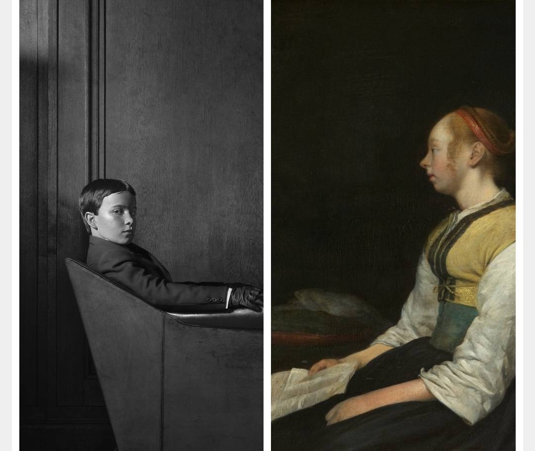 埃爾溫・奧拉夫選擇12幅國家典藏的古典繪畫,以當代攝影手法回應,創造對話。圖左為埃爾溫‧奧拉夫肖像照,右為杰拉德・特.伯爾奇畫作「農民服裝的女孩坐像」。(國美館提供)