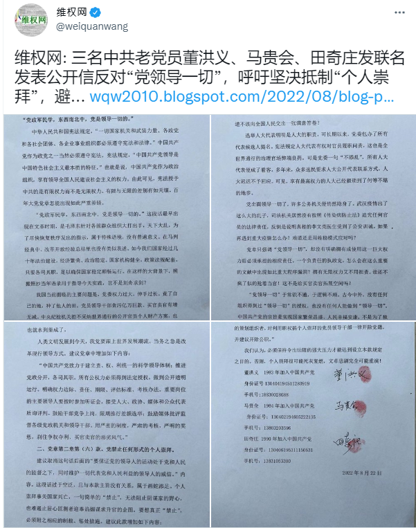 中國共產黨三名老黨員在20大前夕,發文要求黨中央刪除黨章中「黨領導一切」的文字。(Twitter/維權網)