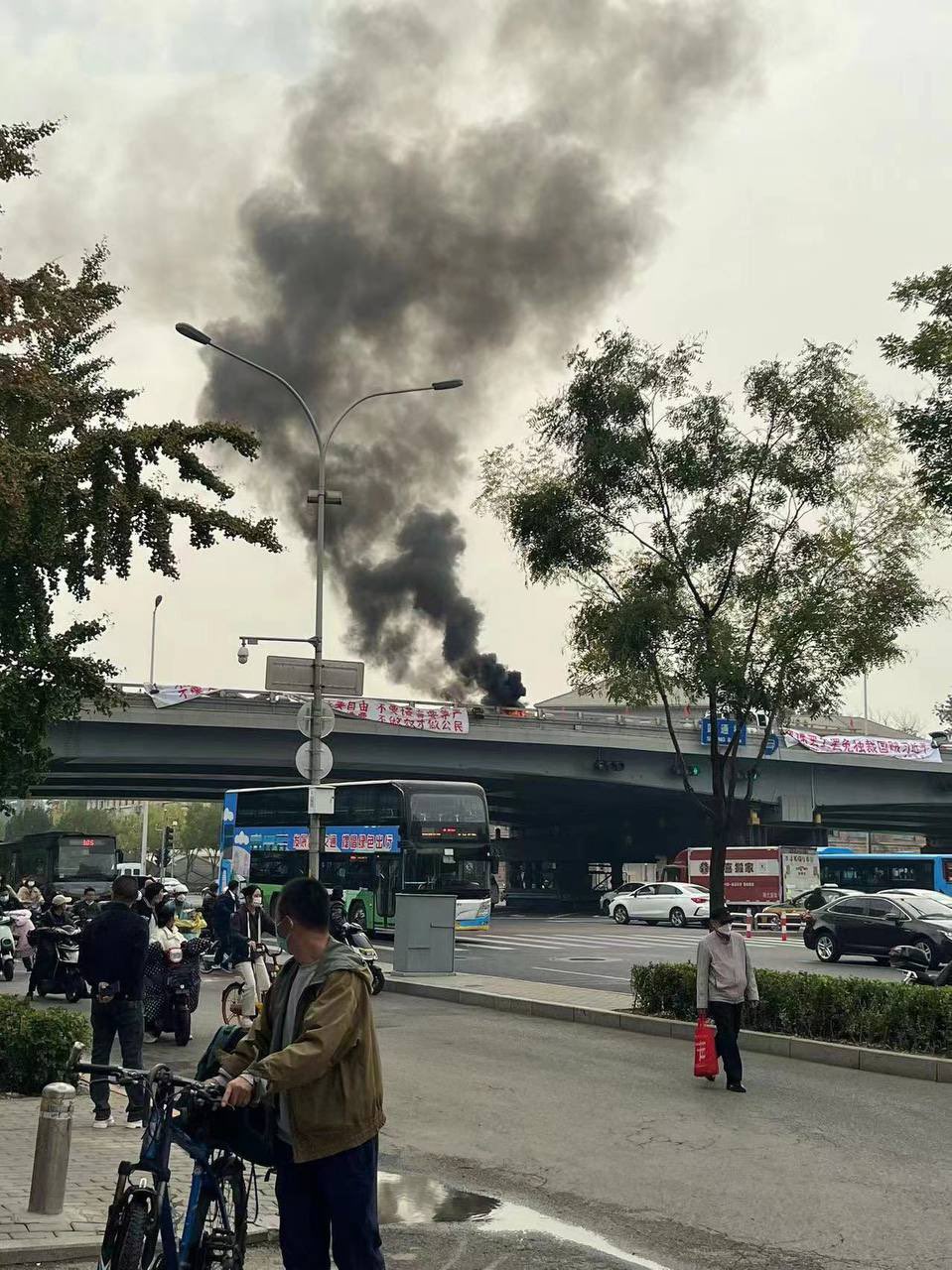 中共20大敏感時刻,北京海淀區四通橋上13日突然出現兩幅大面抗議布條,吸引許多路過民眾觀看、拍攝。(Twitter)