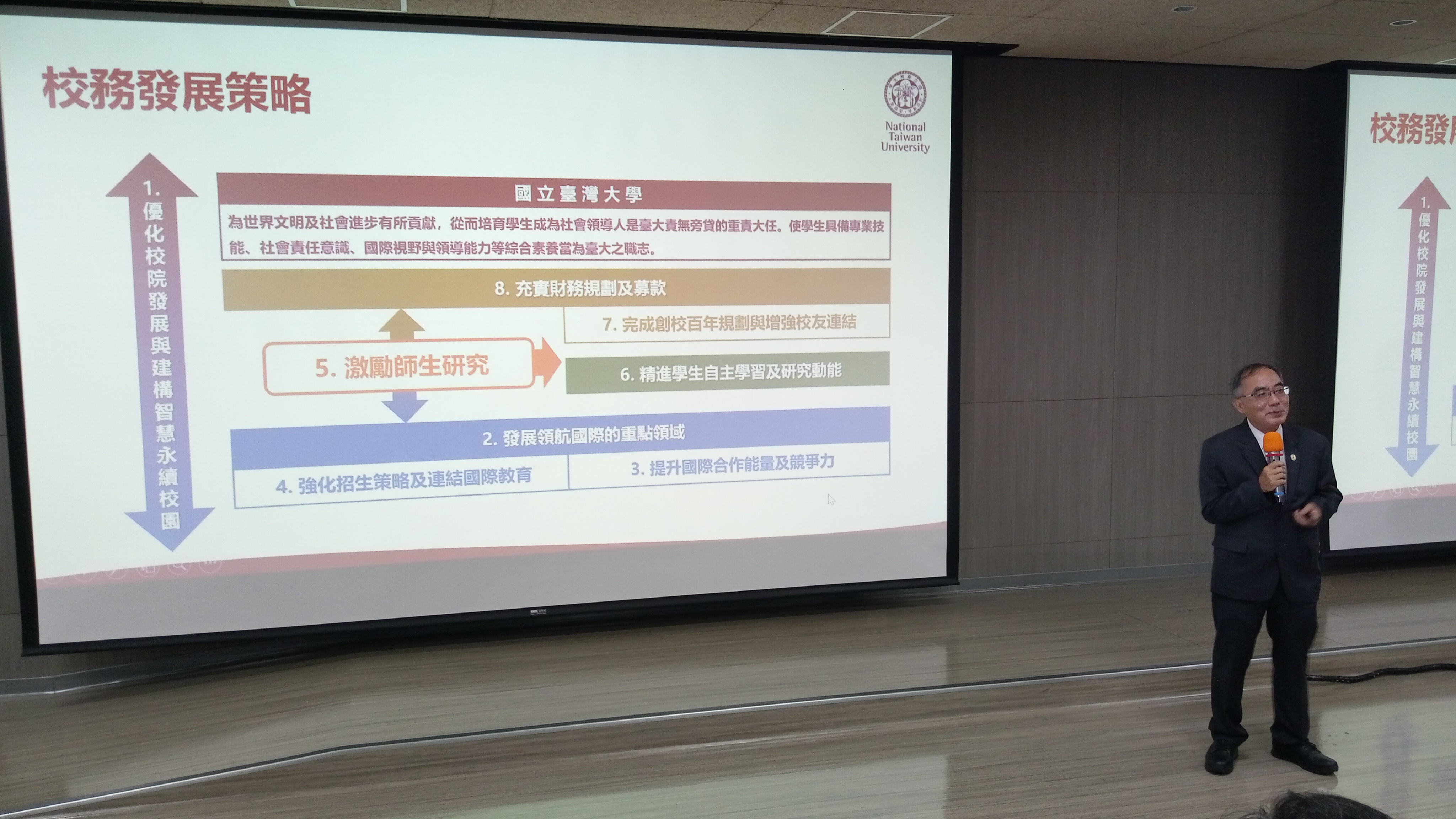 台大新校長陳文章說明未來的治校理念。(陳國維 攝)