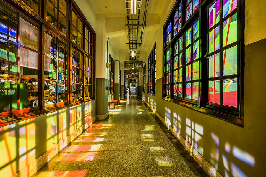 松山文創園區讓古蹟本身成為資產,邀請藝術家一起為松菸注入更多精彩元素,就連古蹟窗戶都變成展演平台。圖為2019年原創基地節 菸田拾影窗貼作品。(松山文創園區提供)