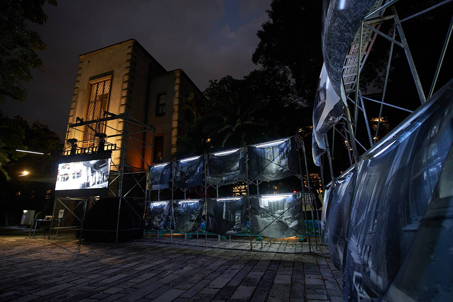 松菸「原創基地節」2019年開始從室內,搬到室外,讓全區都成為展演空間。圖為今年基地節,藝術家郭奕臣〈倖存者計畫〉,首度公開15年前仍是廢墟松菸廠裡珍貴影像。(松山文創園區提供)