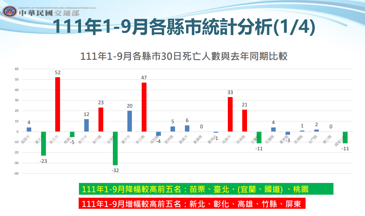 交通部29日公布今年1-9月道路交通事故30天內死亡人數,新北、彰化、高雄、新竹縣及屏東較去年同期增加了176人。(圖:交通部)