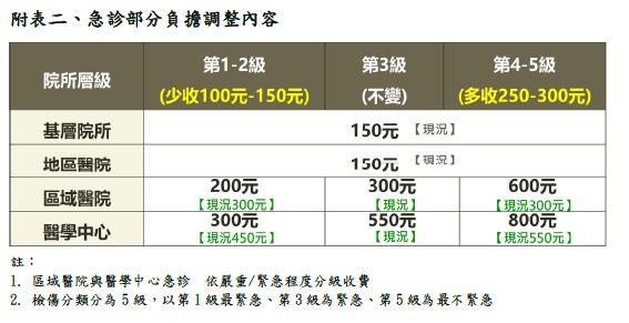 至於急診部分負擔,在醫學中心及區域醫院,調降急診檢傷分類較危急的「第1-2級」部分負擔,分別從450元、300元調降為300元、200元,「第3級」維持550元、300元,較不緊急的「第4-5級」從550元、300元調高為 800元、600元。