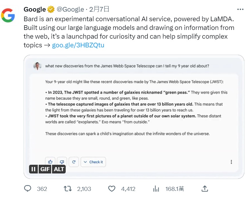 Google聊天機器人Bard 8日在回答韋伯太空望遠鏡的問題上失誤,導致母公司股價暴跌。(圖擷自Google推特)