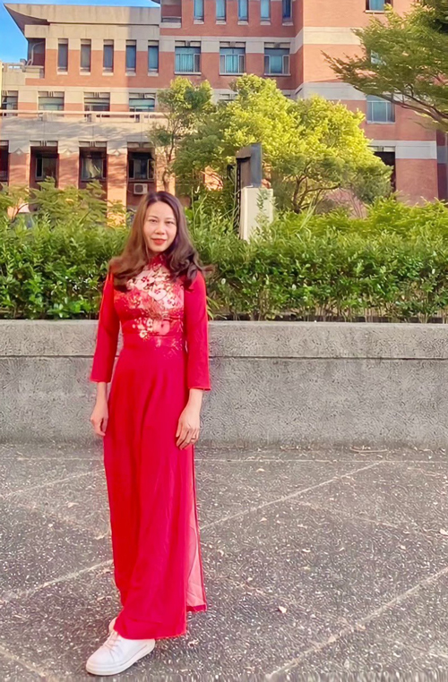 越南籍機構看護工丁氏香是開南大學越裔專班學生,她身穿傳統服裝在校園拍照留念。(丁氏香提供)