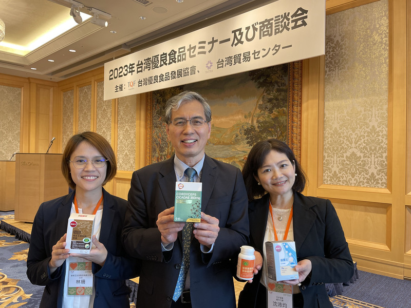 台灣優良食品發展協會(TQFA)率葡萄王生技等11家台灣取得認證的廠商到日本拓展商機。協會駐日代表陳英顯(中)表示,此認證相當於是「護照」,在通路上是品質、衛生安全保證的護照。 (圖:中央社)