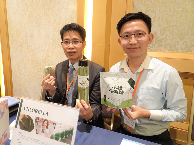 台灣優良食品發展協會(TQFA)率味丹生物科技、嘉一香食品、台灣農畜產工業等取得認證的業者到日本拓展商機。圖為味丹生物科技介紹以綠藻製造牛軋糖、麵條等食品。(圖:中央社)