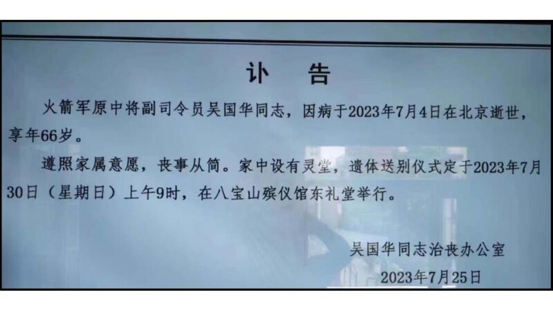網傳2023年7月25日發出的中共前火箭軍副司令吳國華的訃告。(網路圖片)