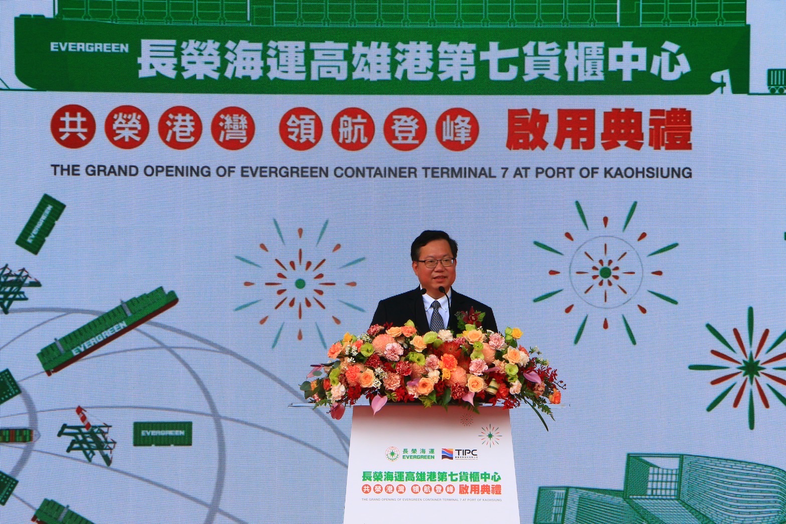 行政院副院長鄭文燦14日在「高雄港第七貨櫃中心」啟用典禮上致詞。(台灣港務公司提供)