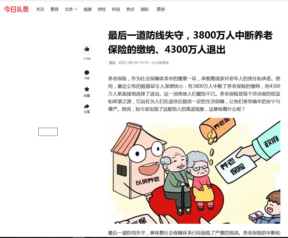 中國經濟下滑,失業情況嚴重,導致中國社會保險也出現危機。中國網民日前貼文指出,中國近期有3800萬人中斷養老保險,更有4300萬人直接退出。中國獨立記者高瑜在社群上評論道,這反映了經濟下行,薪酬降低,許多人無法及時繳納,但這樣的狀況不僅使已經捉襟見肘的國家財政收入受到重創,也會讓養老基金出現資金斷鏈危機,加劇社會不平等的擴大。