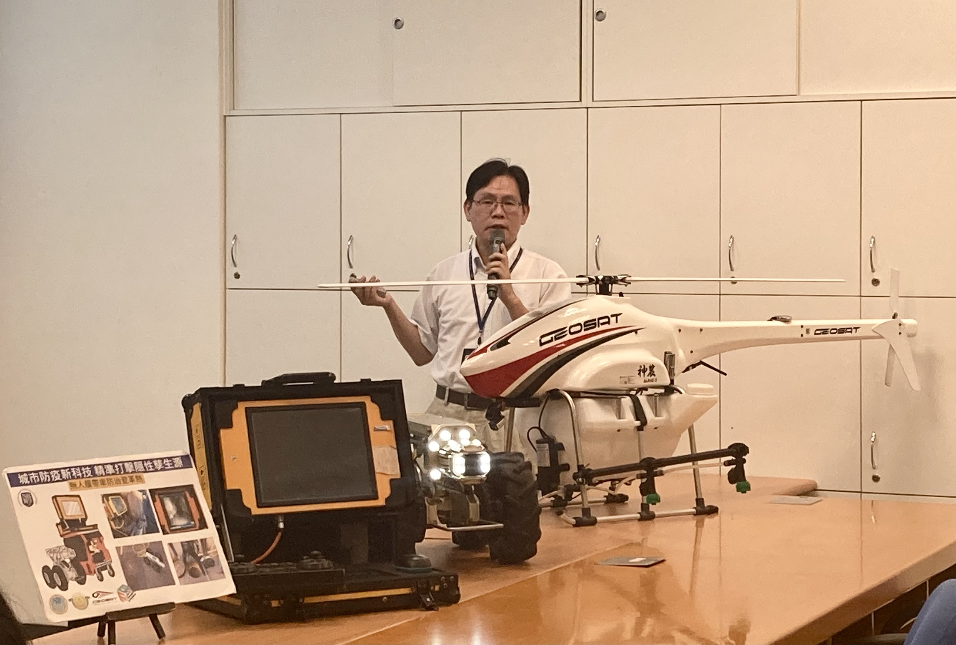 國衛院「國家蚊媒傳染病防治研究中心」劉韋良博士說明,利用無人載具上天下地防治登革熱的成果。(國衛院提供)