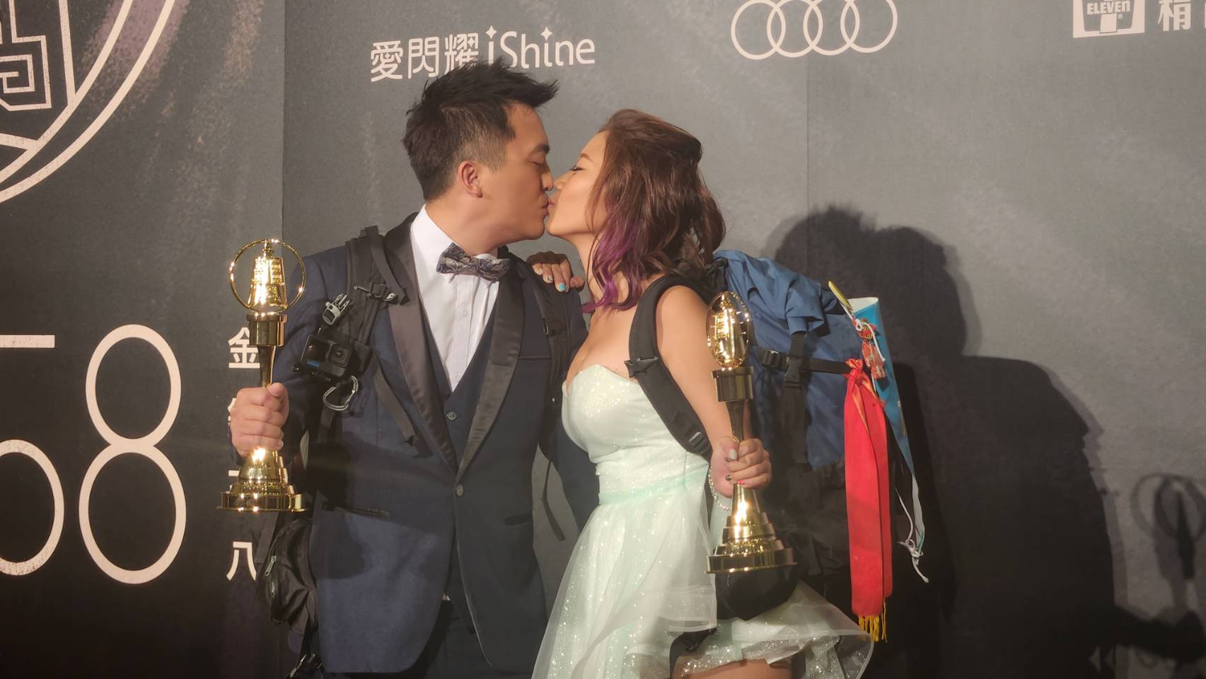 央廣〈深旅FOLLOW ME〉兩位主人屠潔(右)、伊森(左)手持廣播金鐘獎座,在後台應媒體要求開心親吻彼此。(江昭倫 攝)