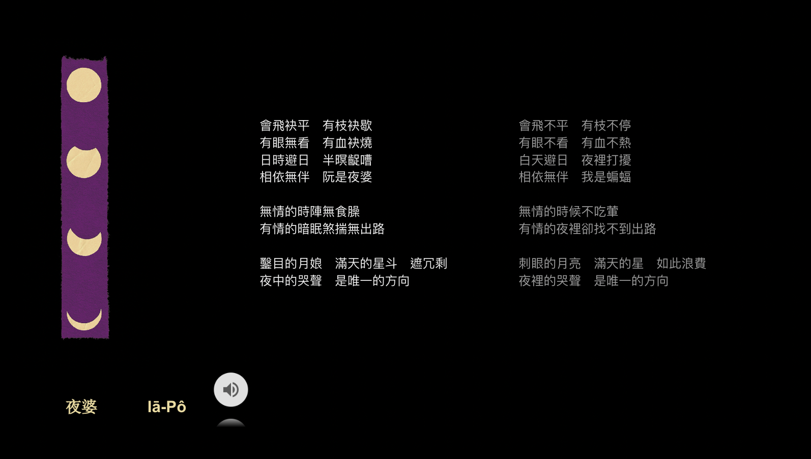 柯智豪說,他今年才寫完最後一首歌〈夜婆〉,〈夜婆〉意思是蝙蝠,以形容不見天日的蝙蝠,隱喻見不得光的戀情,歌詞中原本寫道「夜中的哭聲 是唯一的方向」,柯智豪因為苦無找不到適當的引言,苦思多年。柯智豪:『(原音)我不知道在電視上那個台語劇,我聽到有個老人講「冗剩」這個字,這個很少用,我就跟我爸確定說這個什麼意思,就「浪費」的意思,所以我想說這兩個字我一定要用進去,後來就找到一句「鑿目的月亮 滿天的星斗 遮冗剩」,有點詛咒的感覺,月亮這麼刺眼,這麼的浪費,因為對我來講沒用,所以「夜中的哭聲 是唯一的方向」,所以我就解開這個謎團,所以這張專輯就落地了。』