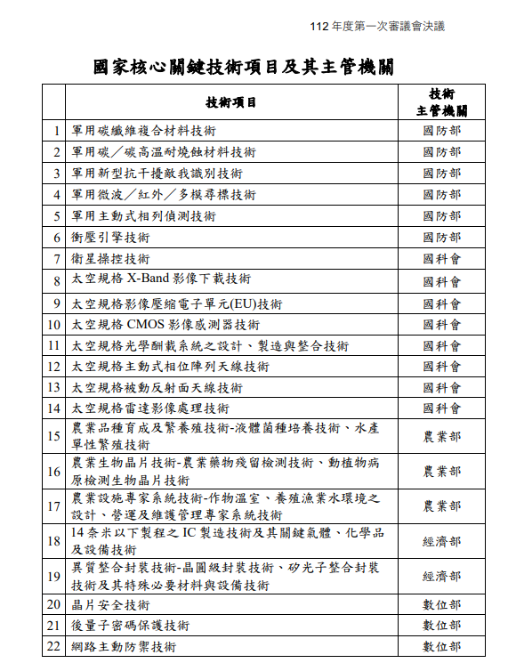 22項技術中,包括「14奈米以下製程之IC製造技術及其關鍵氣體、化學品及設備技術」、「異質整合封裝技術-晶圓級封裝技術、矽光子整合封裝技術及其特殊必要材料與設備技術」、「太空規格 X-Band 影像下載技術」、「衛星操控技術」、「軍用碳纖維複合材料技術」、「農業品種育成及繁養殖技術-液體菌種培養技術、水產單性繁殖技術」等。