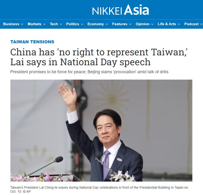 「日經亞洲」(Nikkei Asia)以「賴總統發表國慶演說,稱中國『無權代表台灣』」(China has &39; Lai says in National Day speech)為題報導,賴總統今天在備受各界關注的國慶演說中表示,面對全球衝突及混亂,台灣會繼續承擔應負責任,同時捍衛自身的主權和民主。