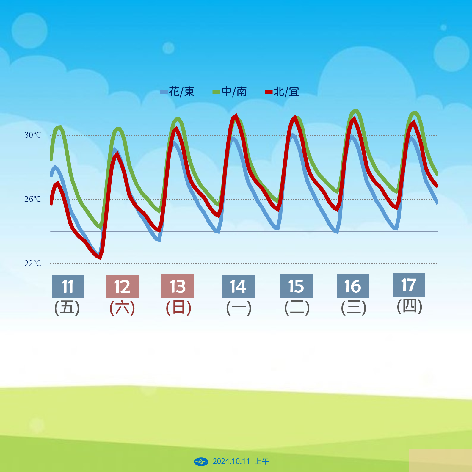 氣象署預估,13日起一直到下周,將轉為偏東風的環境,而且水氣也不多,只有基隆北海岸、東半部地區及大台北山區,一樣是多雲、偶爾有局部短暫雨的天氣,其他地區也是多雲到晴、午後在南部地區跟其他山區有局部短暫雷陣雨的類似情況。主要差別在氣溫,各地低溫都可望回升攝氏2度,高溫更將回升到30度以上,迎來一段秋高氣爽、風和日麗的好時節。氣象預報員黃恩鴻說:『(原音)在週六的清晨以前還是比較涼一些,各地低溫是(攝氏)22-24度;那在周六、也就是禮拜日之後的低溫都逐漸回升,各地來到24至26度。那高溫的話,像今天還比較低一些,在北部、東半部還是27、28度左右,中南部30、31度;不過在周六白天,也就明天白天之後,各地溫度都回升了,北部這邊、東半部也可以來到29、30,那周日之後一直到下周,大概都可以來到各地是30至32度!』
