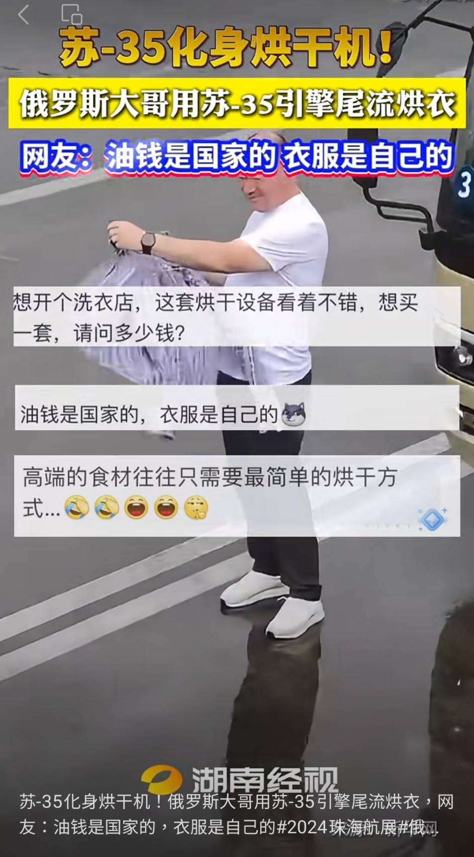 中國網民大為驚嘆,紛紛留言:油錢是國家的,衣服是自己的;超絕鬆弛感;你以為那是戰鬥機,其實是烘乾機;這是史上最貴的烘乾機。