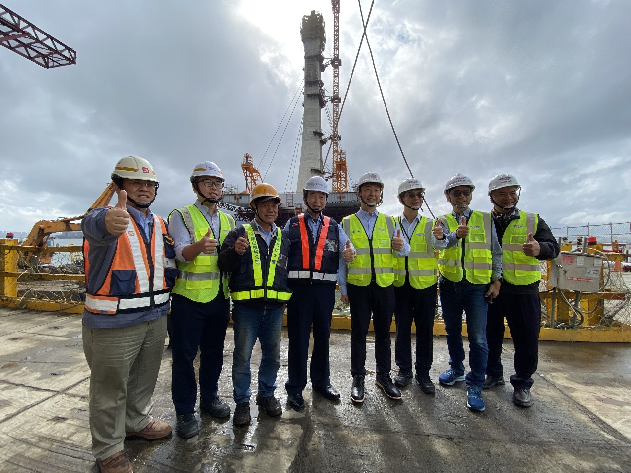 交通部長陳世凱(中右)11日前往淡江大橋工地視察,並與施工團隊,包括工信集團副總裁陳煌銘(中左)、中興工程經理劉永輝(左)和公路局長陳文瑞(右3)率領的團隊在淡江大橋正在施工中的主橋塔前合影。(吳琍君攝)