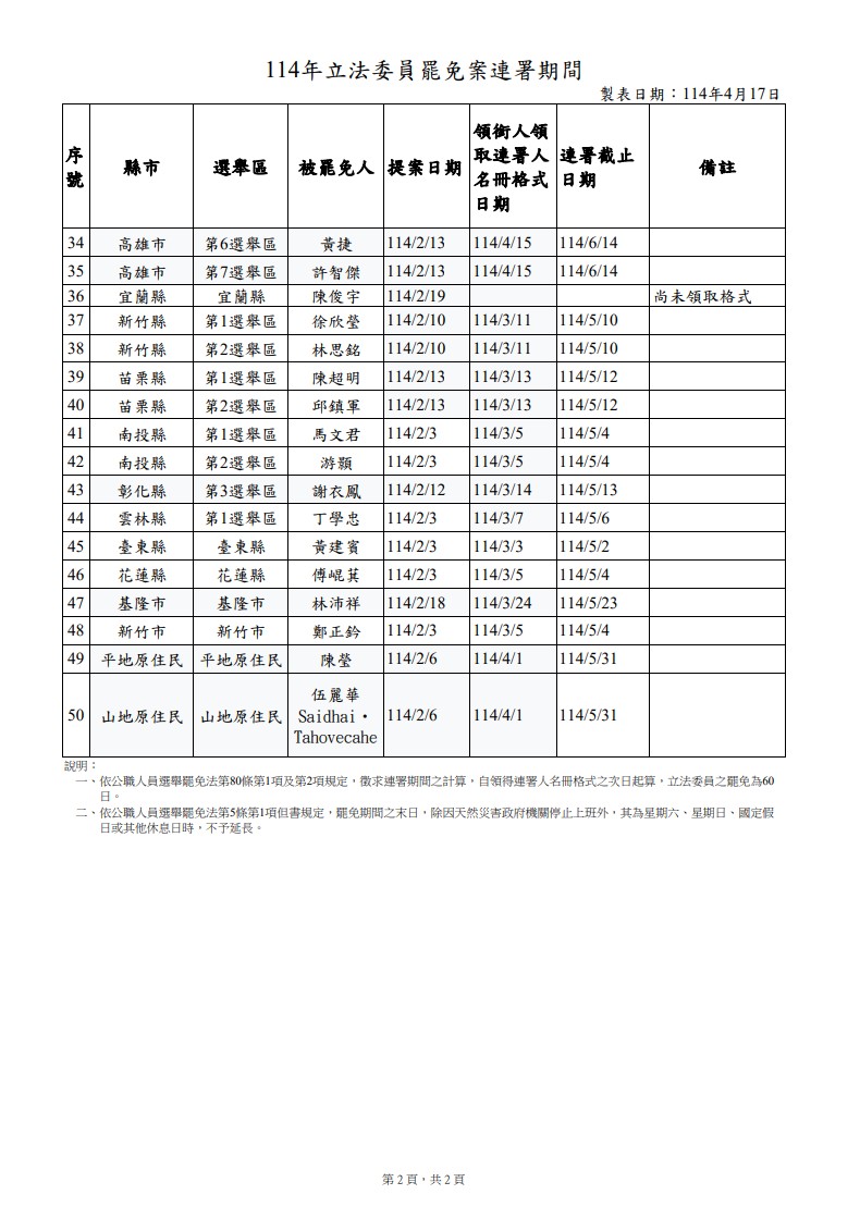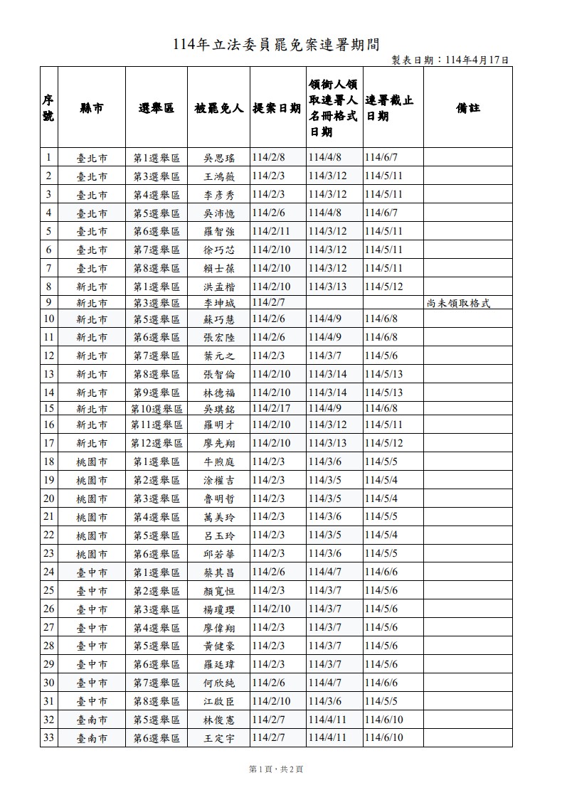 朝野發動「大罷免」,共有35名泛藍立委及15名民進黨立委進入第二階段連署,中選會今天(17日)公布所有罷免案二階連署截止日期,其中,泛藍立委的截止日大多集中在5月中前,已進入倒數1個月內。