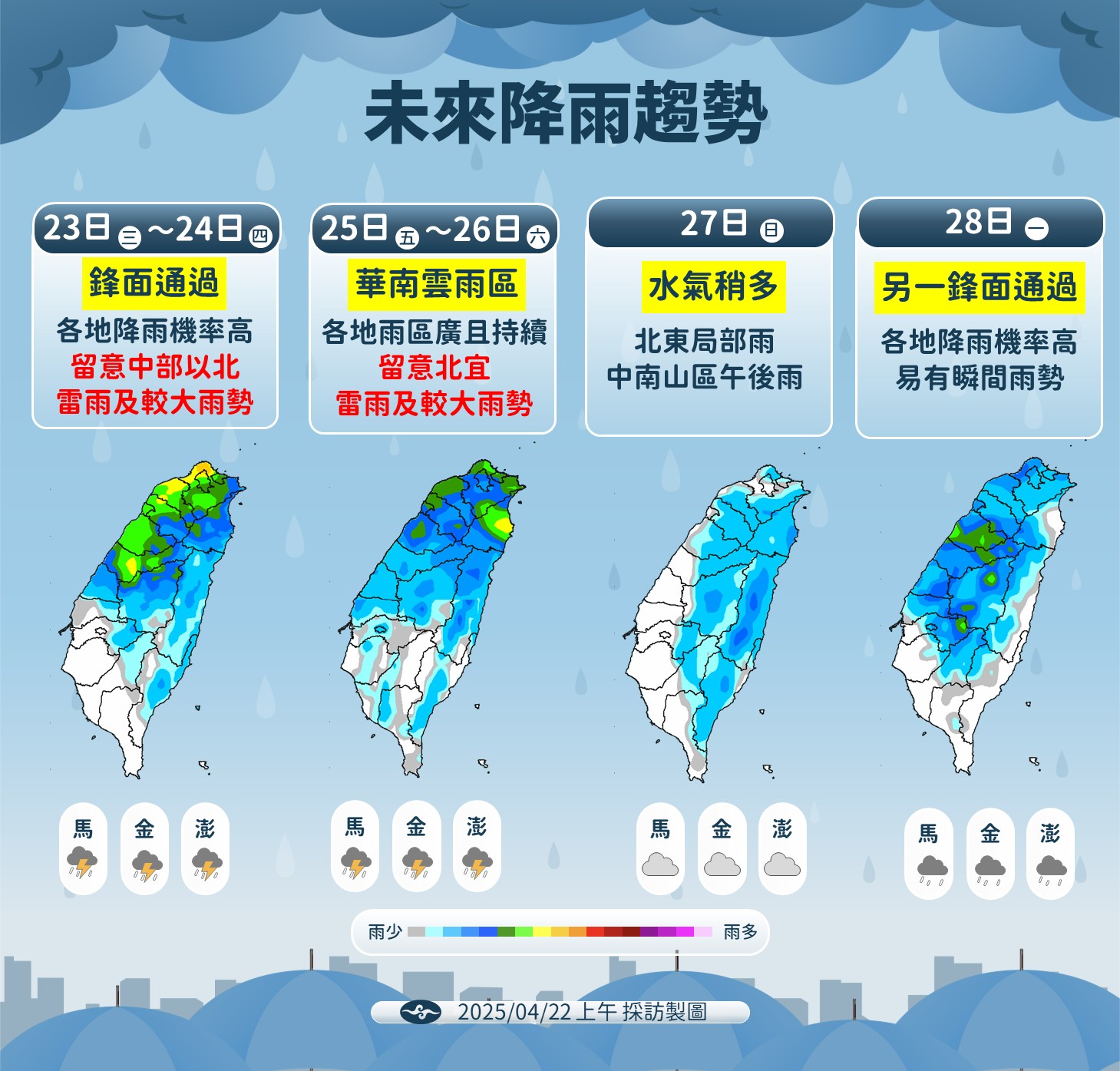 預估鋒面通過後,25、26日將轉為東北季風增強、伴隨華南雲雨區東移。屆時除了北部、東北部和東半部的天氣將轉涼,北部低溫下探18、19度,高溫也只有21、22度;中部高低溫則是21-24度,南部23-26、27度、花東20-25度。此外,降雨區域也將擴大,除了中部以北依舊是短暫陣雨或局部雷雨,東半部則是局部短暫陣雨外,南部地區也會轉為零星短暫陣雨,而且北部及東北部地區也可能出現局部較大雨勢。