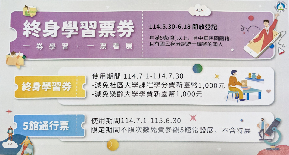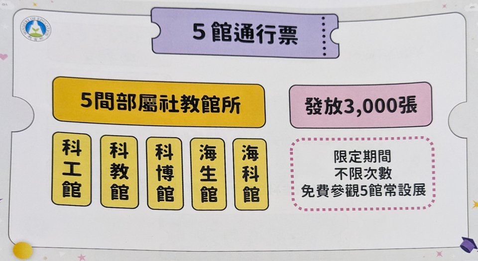 另外,為了鼓勵國人「活到老,學到老」,教育部將發放2萬張「終身學習票券」以及3千張「5館通行票」,終身學習票券可用於抵免社區大學課程學分費以及樂齡大學學費,而5館通行票指的是可不限次數免費參觀國立自然科學博物館(簡稱科博館)、國立科學工藝博物館(簡稱科工館)、國立台灣科學教育館(簡稱科教館)、國立海洋科技博物館(簡稱海科館)以及國立海洋生物博物館(簡稱海生館)的通行年票,明天(30日)起至6月18日開放6歲以上國人登記抽領這兩種票券。梁學政說:『(原音)(記者:學習票券今年預算是超過新台幣2千萬元?)對,因為2萬張,一張1千元,就兩千萬了,那我們還有那個5館通行票,那個也花好幾百萬元,那是免費的年票...(記者:不限次數(參觀)?)對,你可以去各館問問看,他們的年票有的從幾百塊到幾千塊錢,這個抽到就是免費,你想要去就去。(記者:所以明年有可能預算可以的話就...)對,我們就也是要看今年,如果說民眾有這麼樣的需求,就像剛才(有人)講說,為什麼不普發?普發就是變成說經費嘛...如果說有這個需求,我們當然經費這邊就會開始慢慢來增加這樣子。』