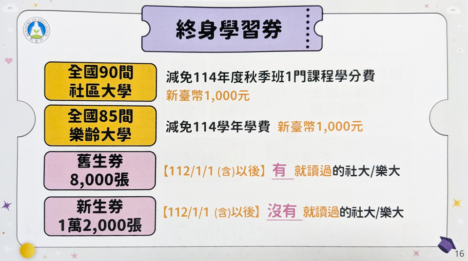 教育部29日宣布將免費發放2萬張「終身學習票券」以及3千張「5館通行票」。(圖擷自教育部簡報)