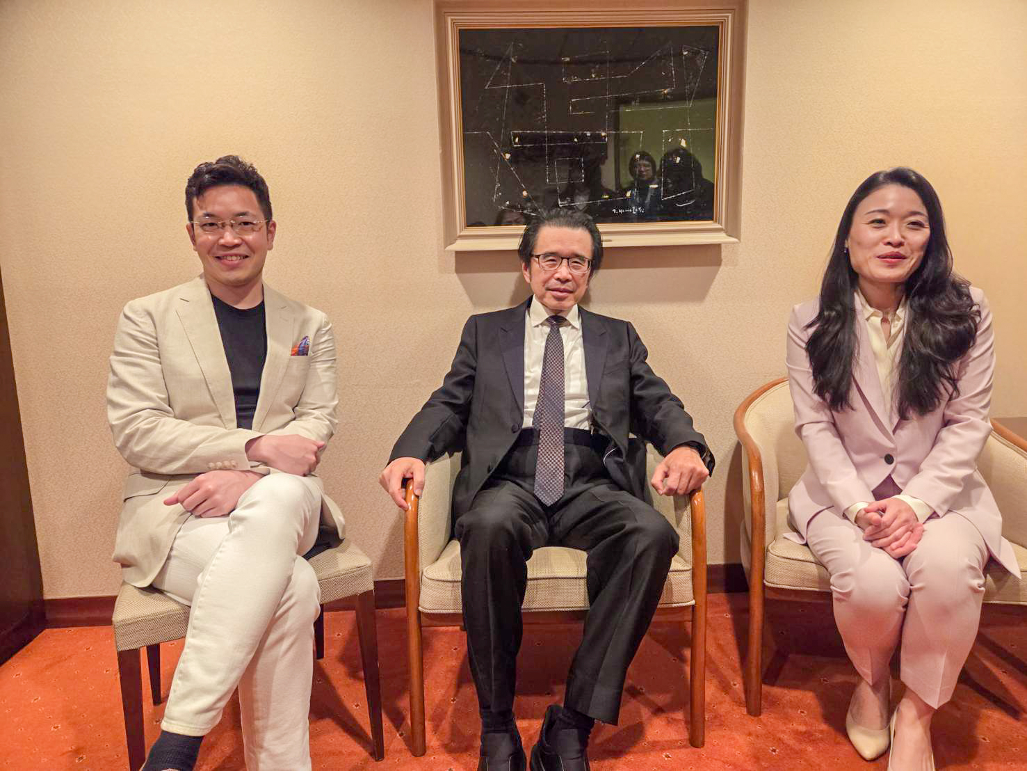 NSO首次在東京三得利音樂廳演出,隨行獨奏家黃俊文(左起)、作曲家金希文、陳可嘉,都覺得很開心參與。(江昭倫 攝)