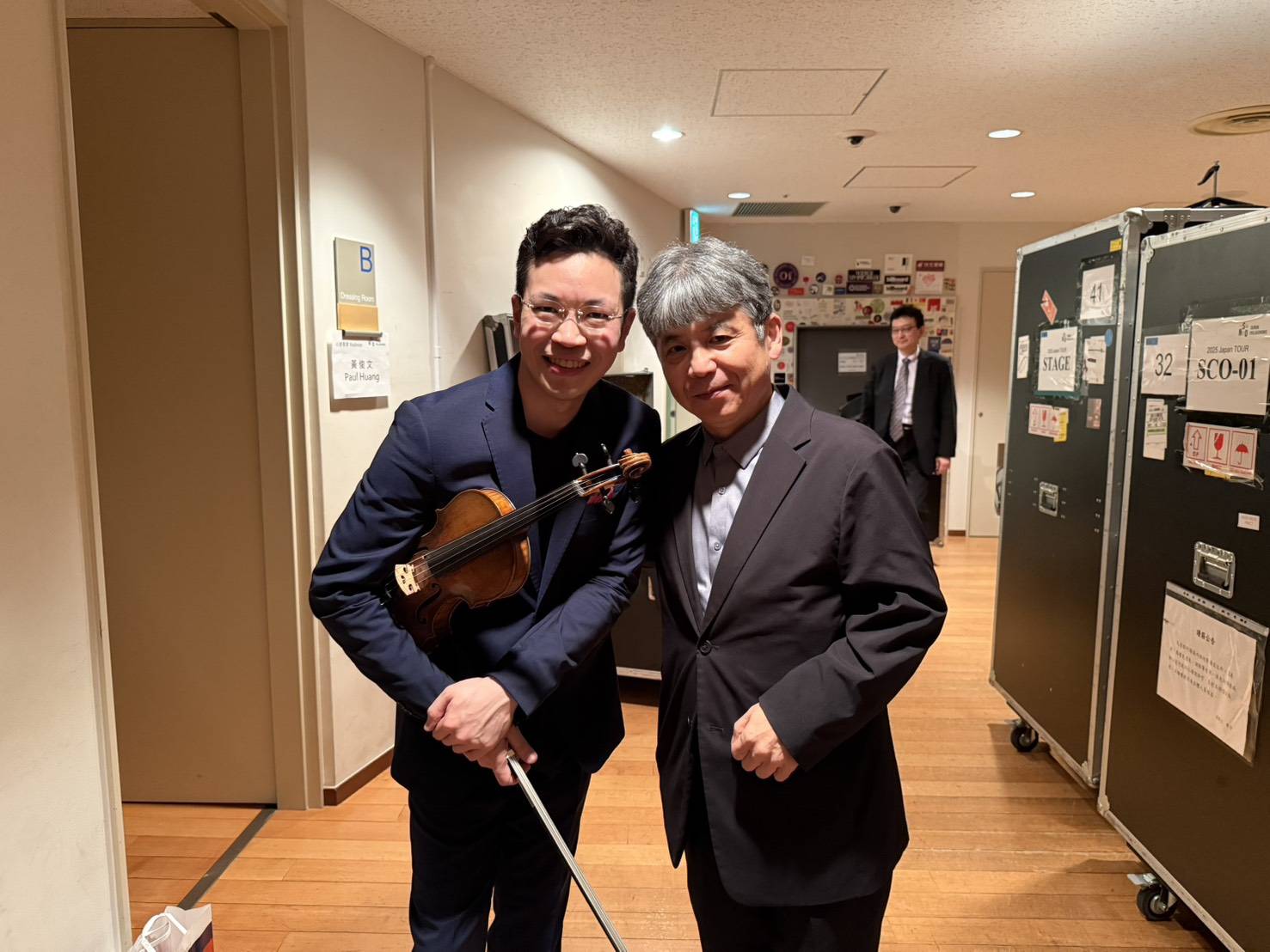 日本頂尖作曲家細川俊夫(右)不只到場聆聽NSO東京演出,也特別到後台和小提琴家黃俊文(左)相見歡。(NSO提供)