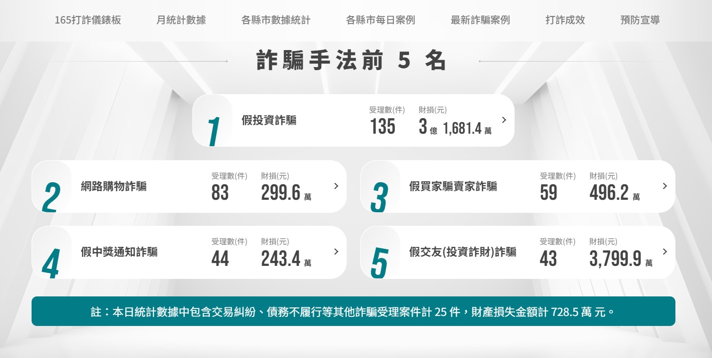 打詐指揮中心表示,隨著科技發展及通訊軟體普及,傳統電話詐騙方式已逐漸演化成為利用網路釣魚網站、假投資平台、深度偽造等方式,而股市持續興盛,也讓許多不法分子利用假冒投資顧問名義吸引民眾投入資金,致詐騙手段變得更加複雜且隱蔽。