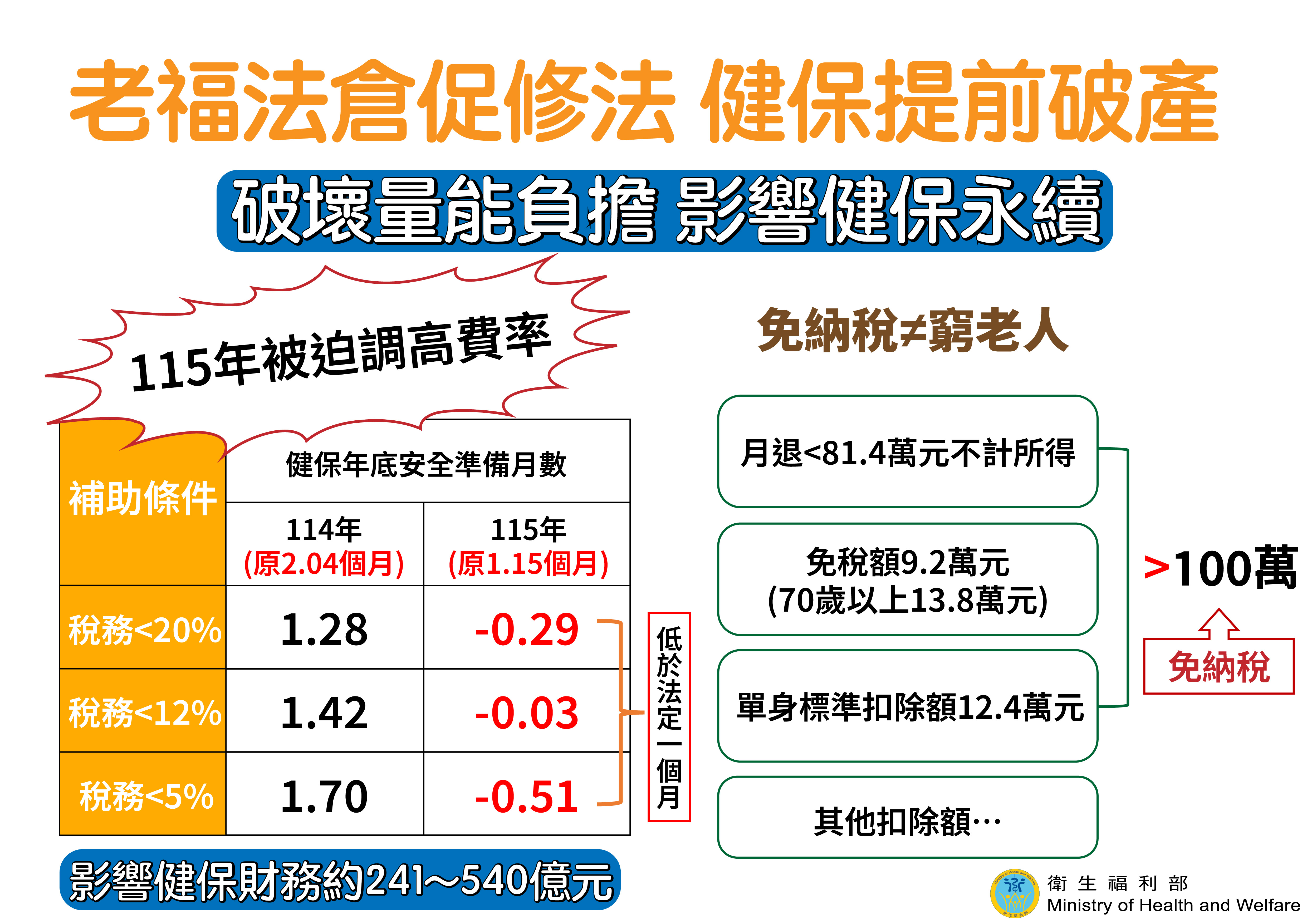 次長林靜儀指出,雖然修的是《老人福利法》,但會連動到健保預算,粗估如果綜合所得稅率20%以下65歲以上長者免繳健保費,健保明年度就可能出現新台幣540億缺口,如果5%以下,仍會有241億缺口,到2026年健保就可能提前破產,可能就得調高健保費。林靜儀:『(原音)(原音)依照健保法,我們必須要有安全準備金一個月以上,那所以說如果我們在健保的收入,明顯的就是說,不論是少241億或是少540億,我們的安全準備金到115年(2026年),都會不足一個月,那如果是20%以下,我們少了是540億的話,健保的安全準備金直接就就已經是破底了,那如果就算是以5%來算,目前的估算健保所少掉的,那到時候安全準備金只剩下0.5個月,一樣少於一個月。』