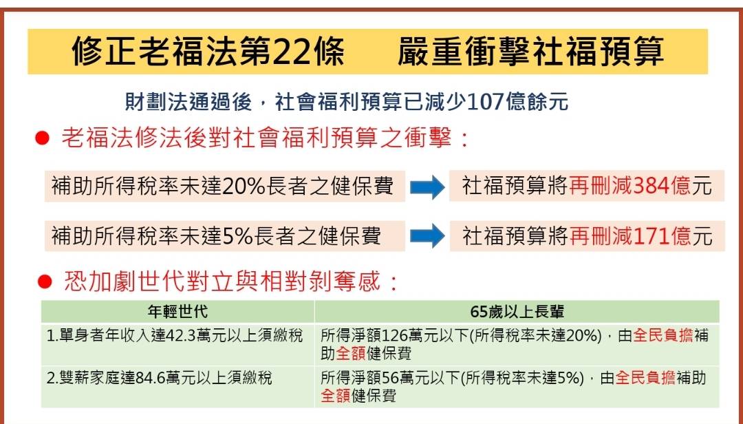 另外,次長呂建德也強調,若《老福法》修法,將衝擊社福政策。補助所得稅率未達20%長者的健保費,社福預算將再刪減384億,補助所得稅率未達5%長者的健保費,社福預算將再刪減171億,將排擠社會預算,嚴重衝擊社會安全網,特別是幫助弱勢者脫貧的社工、身心障礙社區資源佈建、獨居老人關懷服務志工等弱勢家庭照顧,都可以無法再編列預算支應。