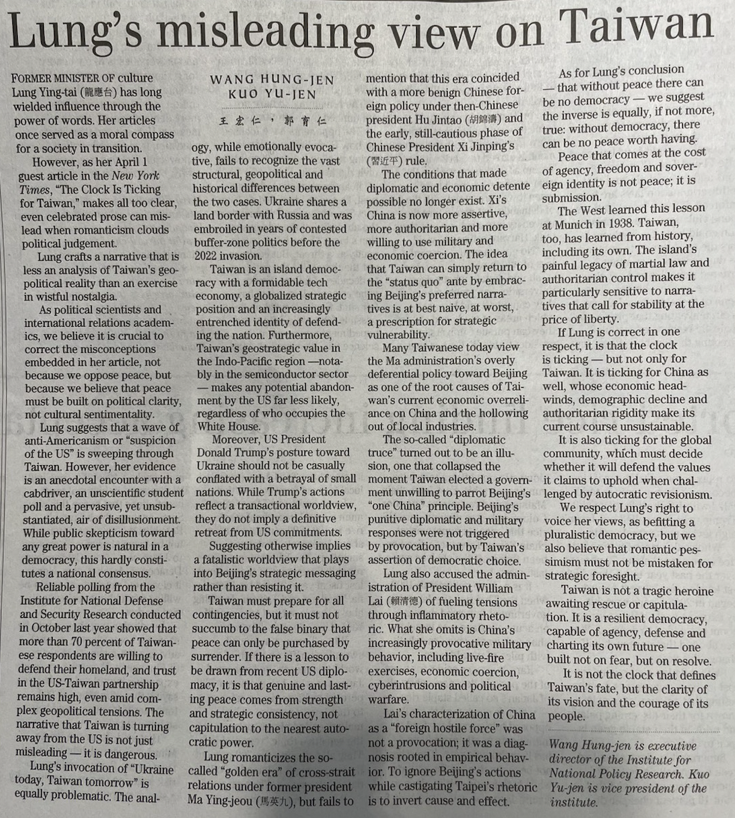 國策院執行長王宏仁與副院長郭育仁兩位政治學與國際關係教授,聯名在英文媒體Taipei Times發表專文Lung’s misleading view on Taiwan(龍應台對台灣的誤導性觀點),回應前文化部長龍應台在2025年4月1日發表於《紐約時報》文章〈The Clock Is Ticking for Taiwan〉,針對龍文「疑美」、「烏克蘭比擬」、「兩岸和平」與「挑釁責任」的觀點逐一反駁,兩位學者更直白指出龍文:「即使文筆再優美,也可能因為浪漫主義遮蔽政治判斷而產生誤導。」。